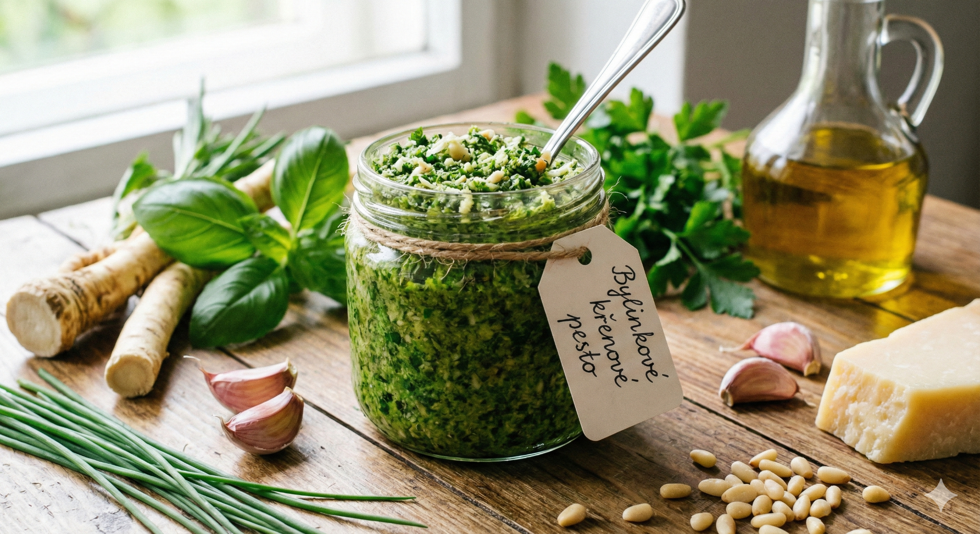 Vše mimo olej rozmixujte v kutru. Přidejte olej a promíchejte. Případně nařeďte vodou nebo vývarem. Dochuťte solí, pepřem.